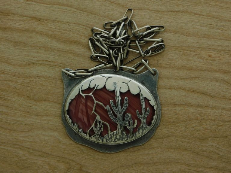 • Fabulous one-of-a-kind diorama 3 dimensional desert necklace by Ute / Acoma Silversmith Adam Ramirez.