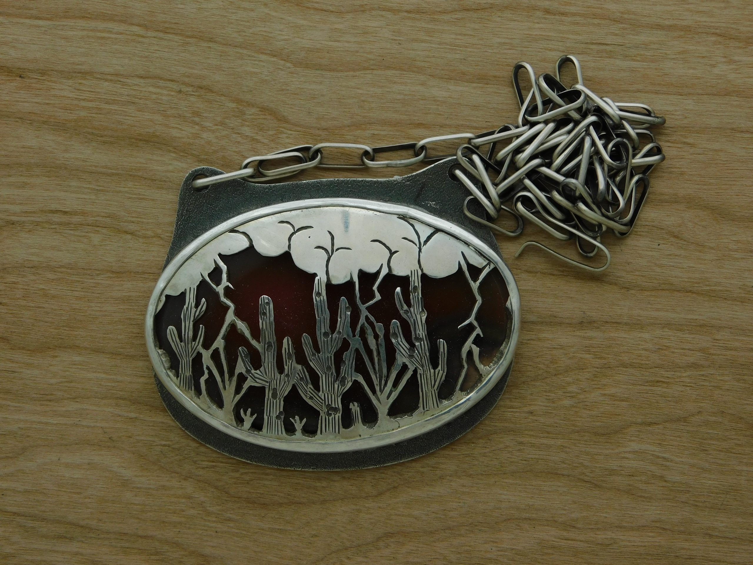 - Fabulous one-of-a-kind diorama 3 dimensional desert necklace by Ute / Acoma Silversmith Adam Ramirez.