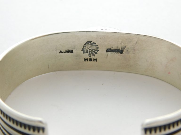 • This bold silver work is distinctive of Al Jake, a Navajo silversmith.