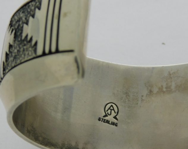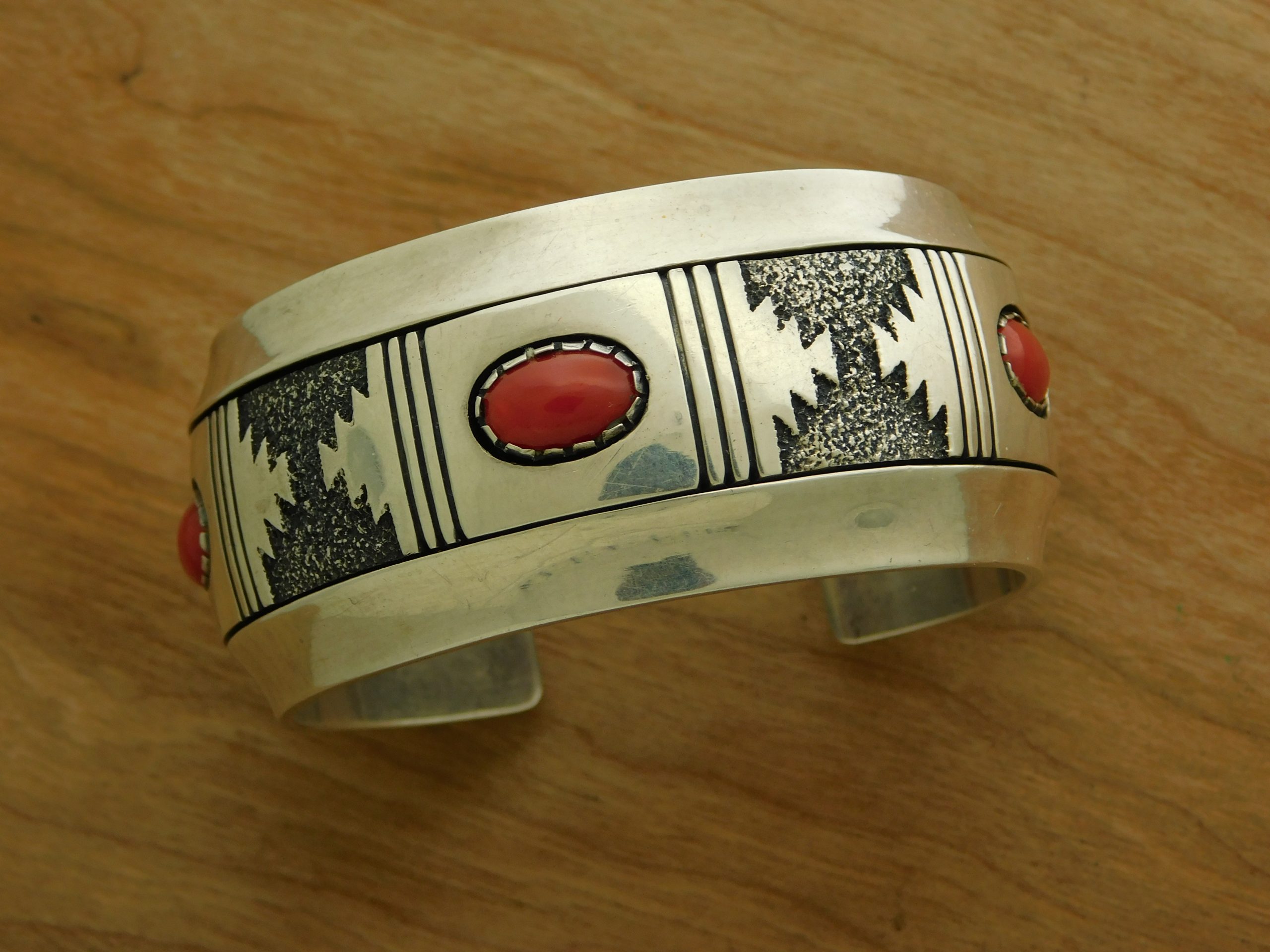 - Fabulous Navajo Symmetrical Sterling Silver shadowbox cuff with coral cabochons by award winning Alfred Joe.