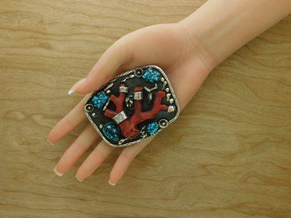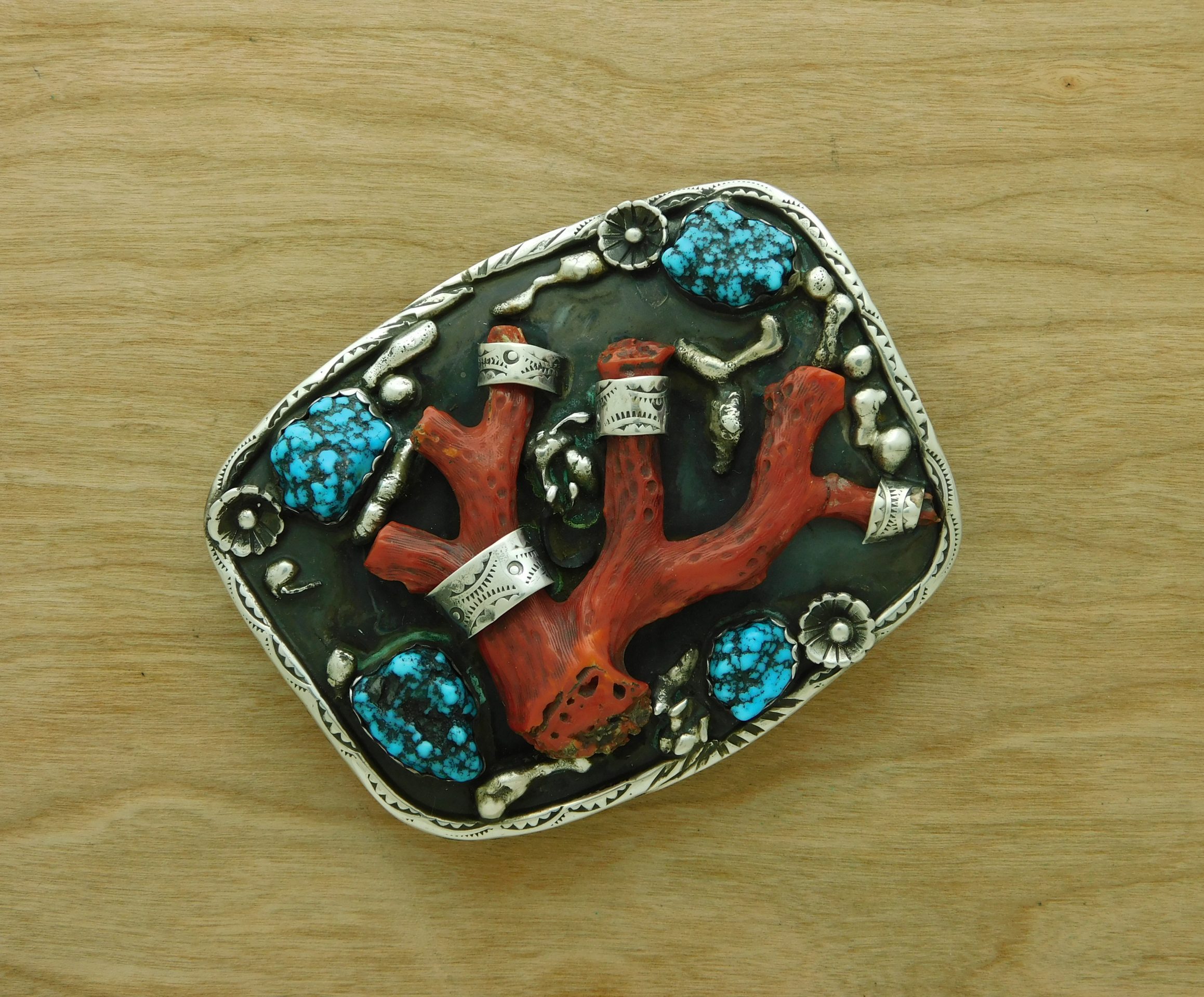 - Fabulous Sleeping Beauty Turquoise and Branch Coral Sterling Silver belt buckle.