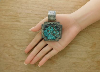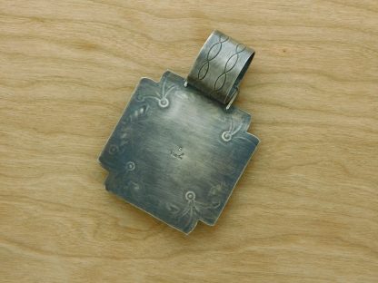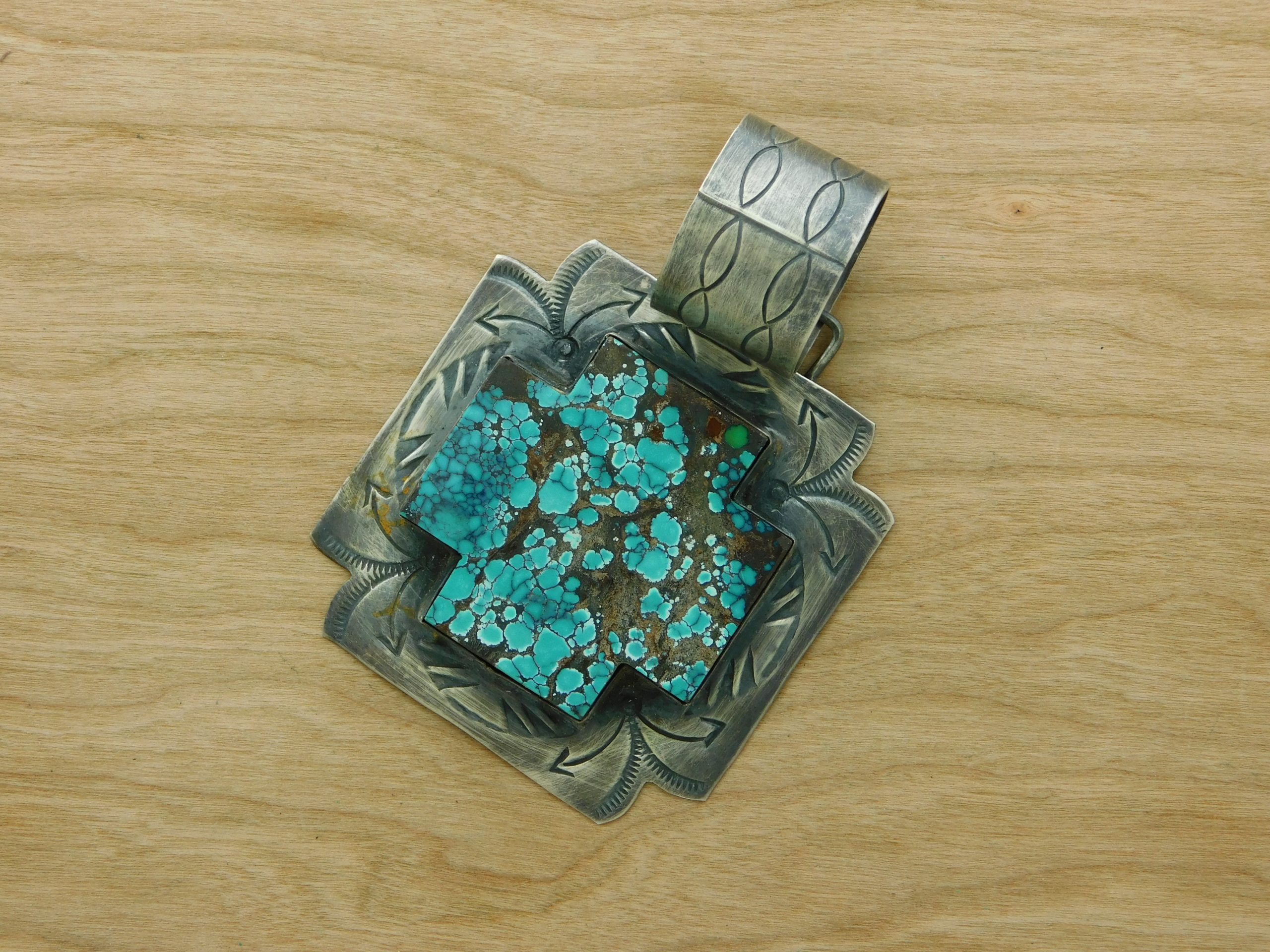 Contemporary sterling silver cross featuring beautiful spiderweb Turquoise by famed Navajo silversmith Dean Sandoval.