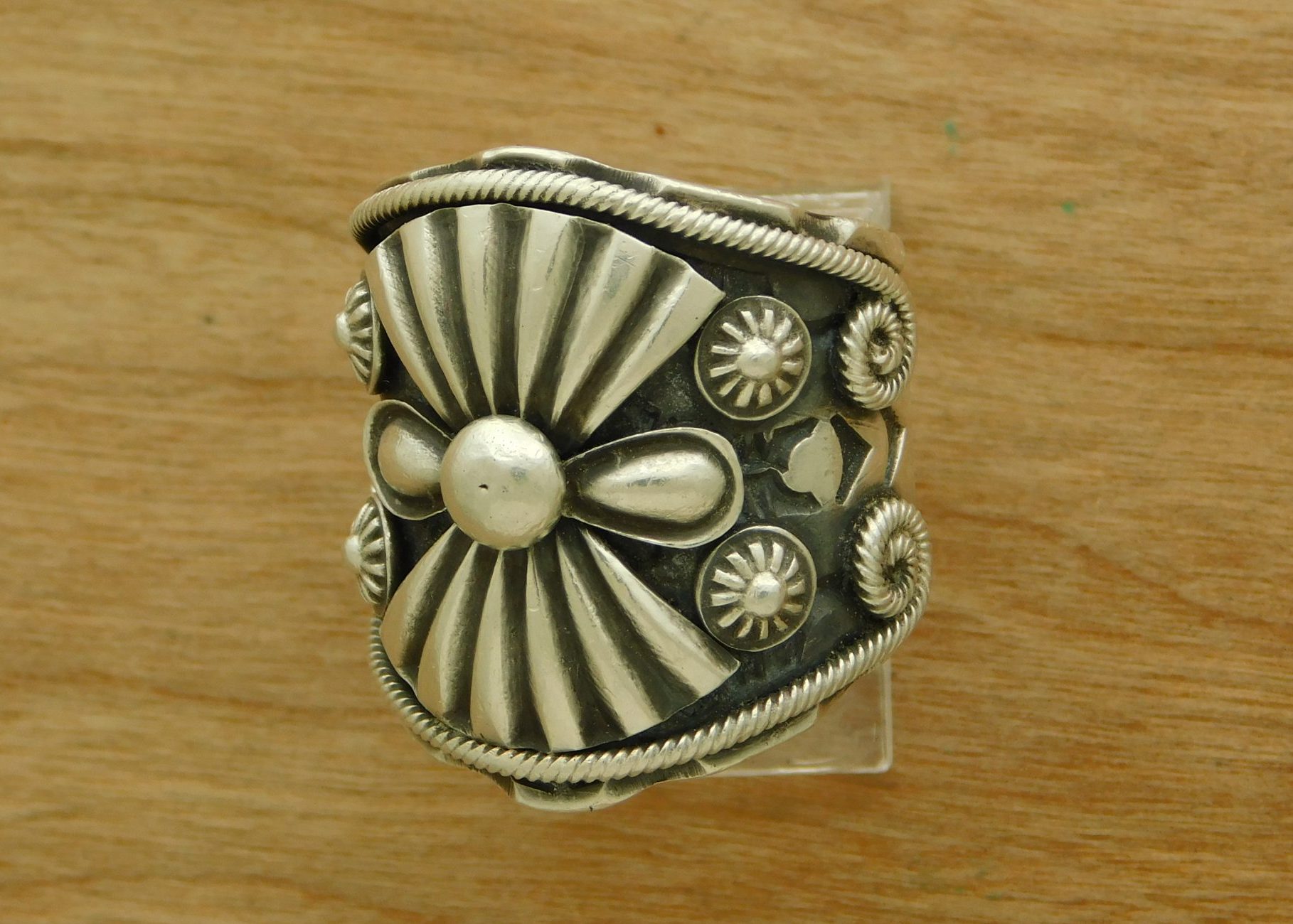 - Handsome Delbert Gordon Sterling Silver ring with fan, wheel, rope twist and repousseβ embellishments.