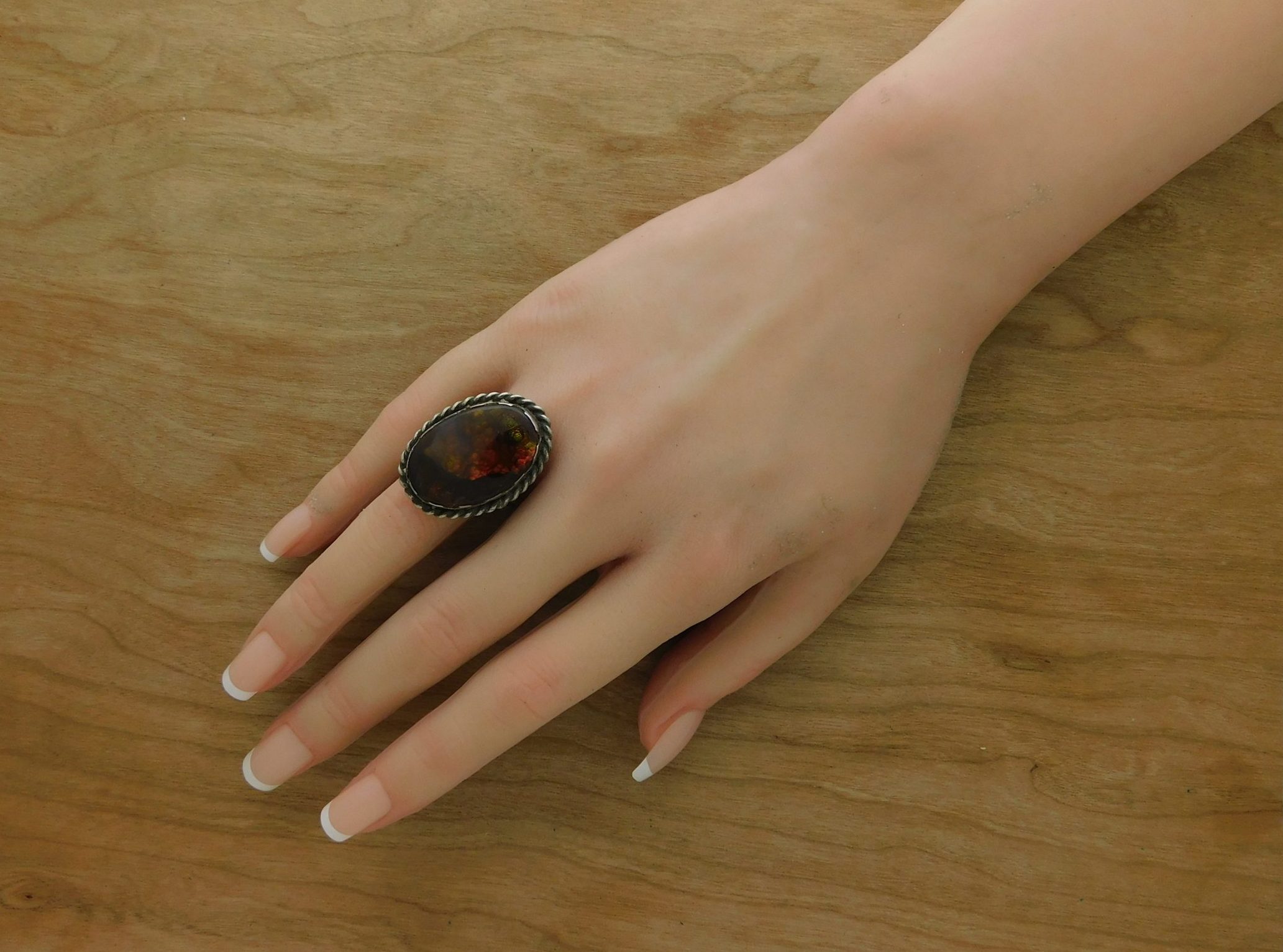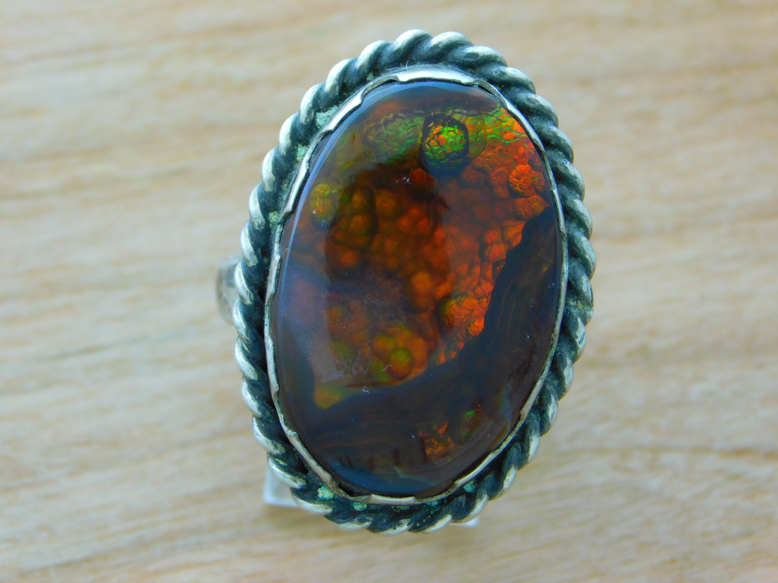 - Fabulous Fire Agate ring with reds and greens changing in the light!
