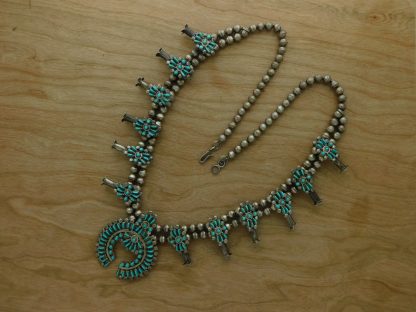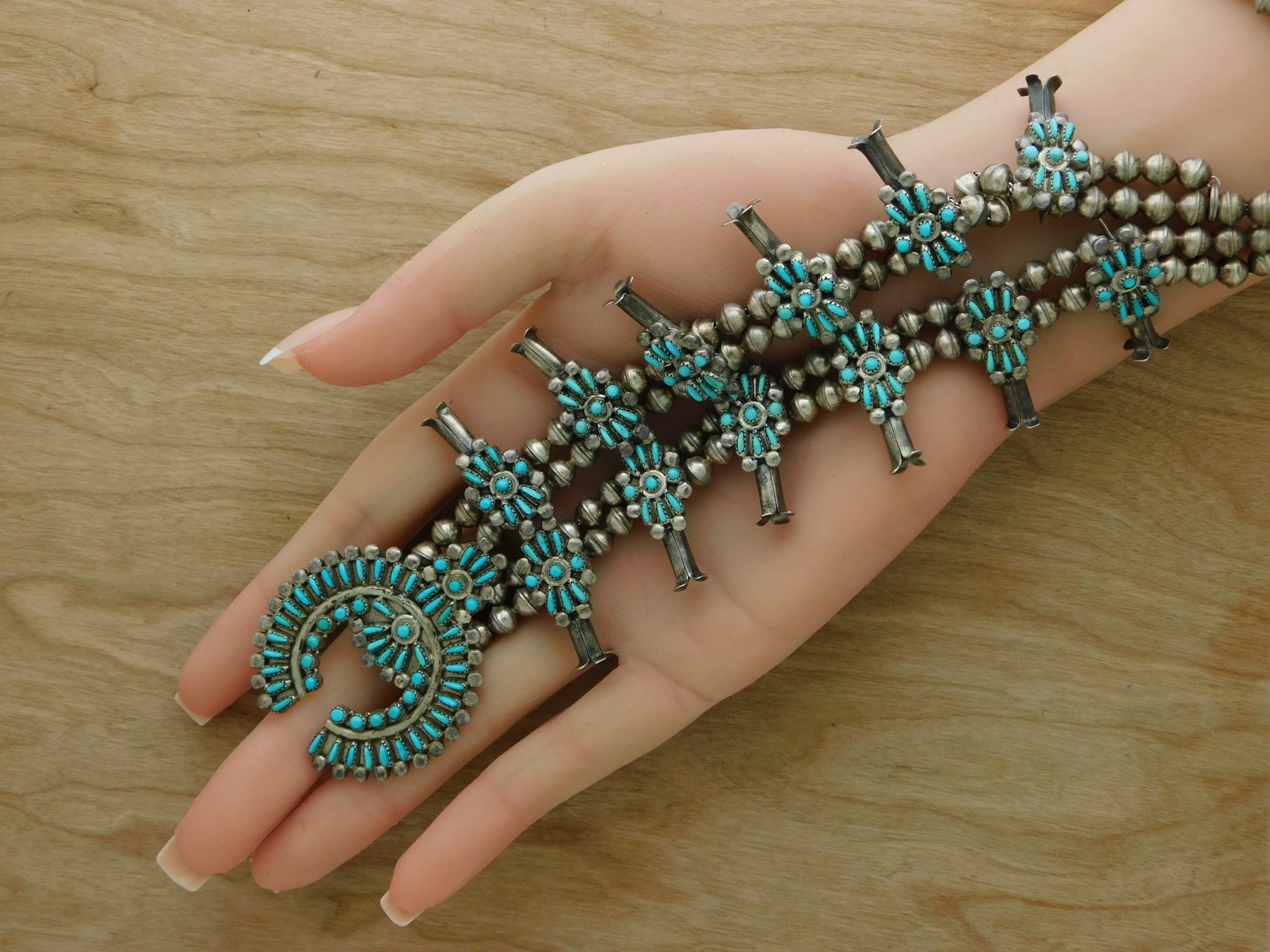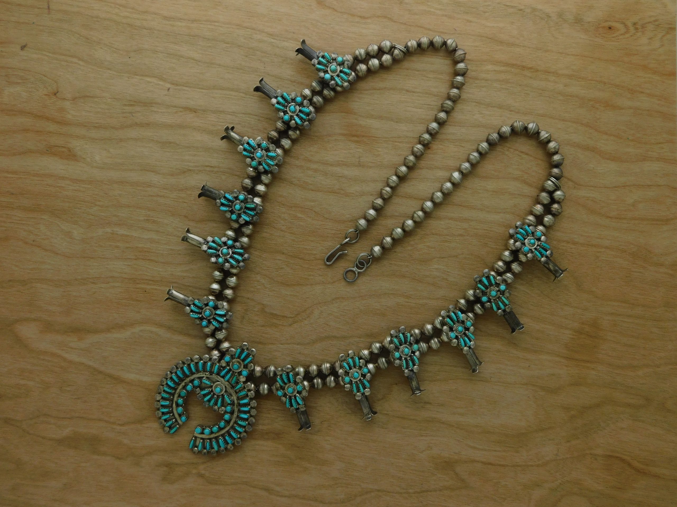 - Fantastic circa 1940βs β 1950βs Zuni squash blossom necklace with handmade (bench) beads.