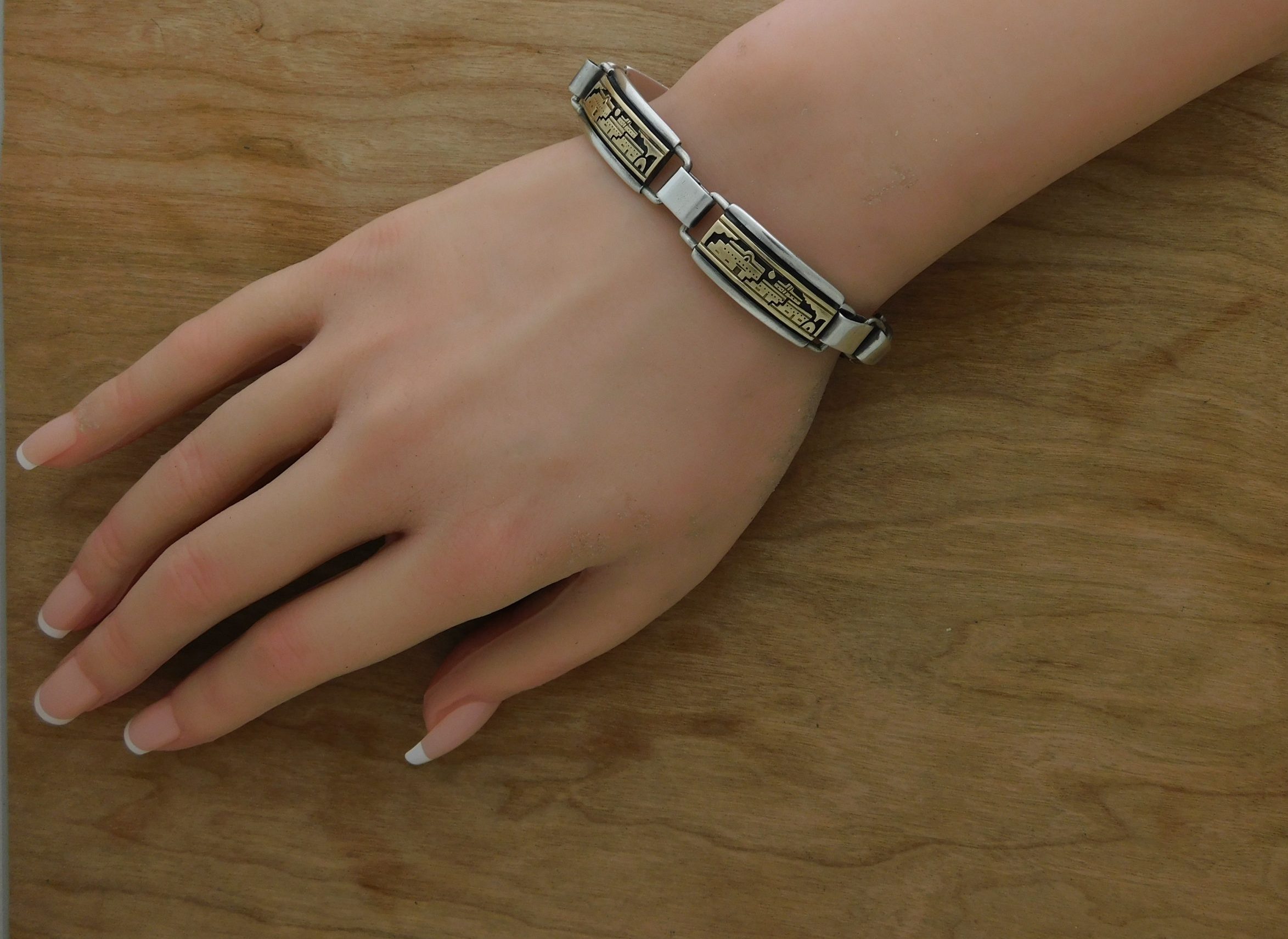 - This story teller bracelet features Pueblo scenes, fashioned of 14kt gold and Sterling Silver