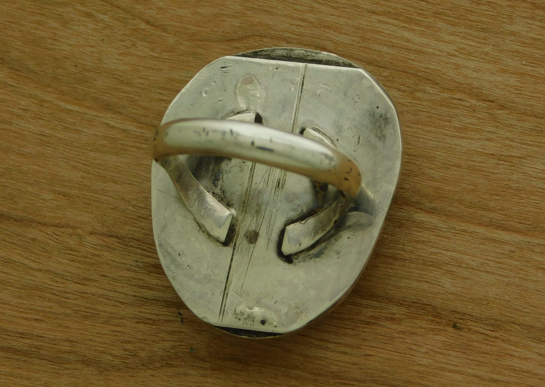 - Rough turquoise nugget with hand cut scalloped bezel securing the stone.