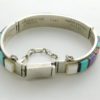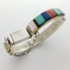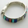 - This is a rare vintage three panel sterling silver bracelet with raised turquoise, red coral, Mother of Pearl, Lapis, Sugilite, and Jet channel-inlay bracelet.