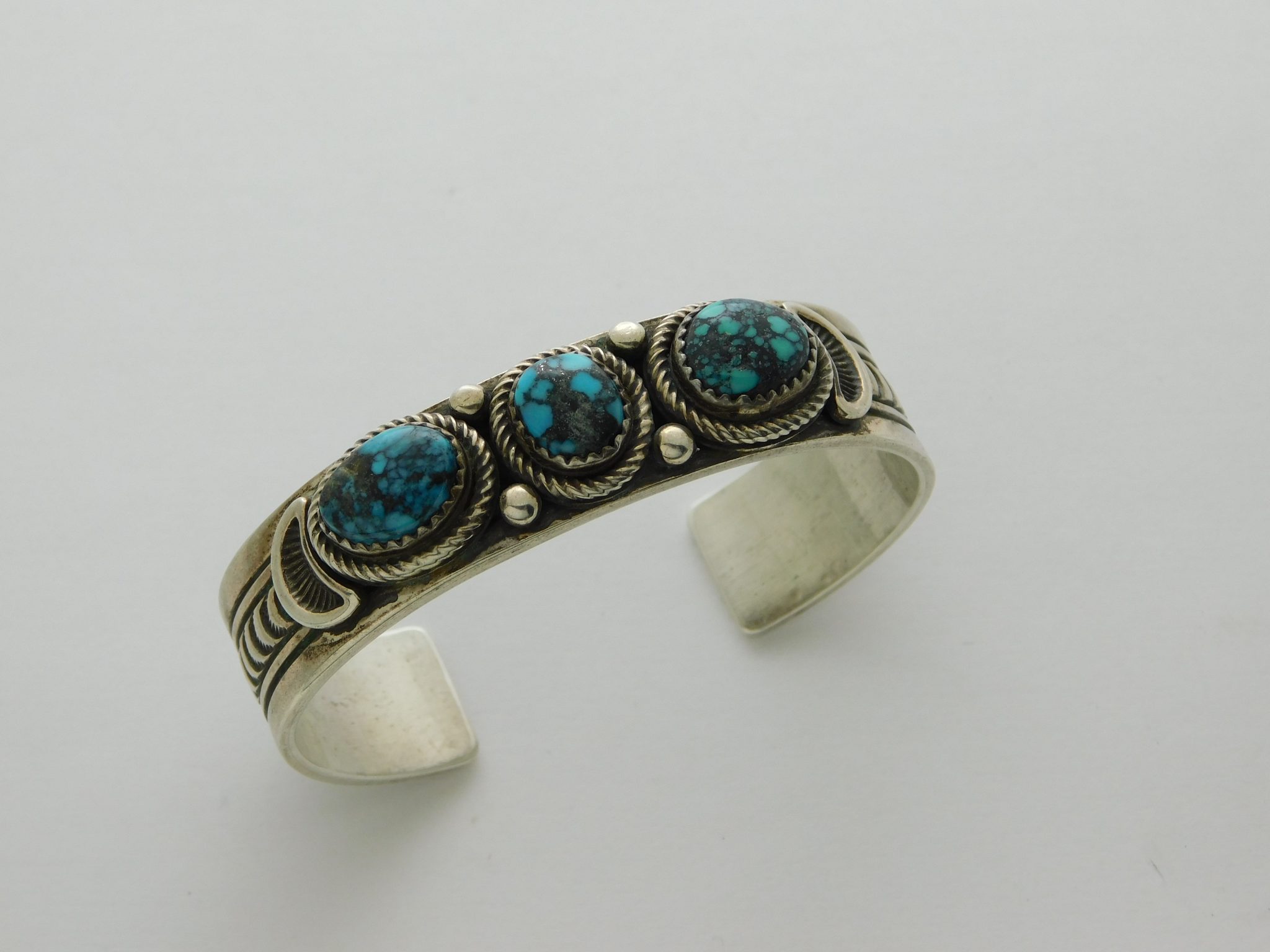 - Fabulous Older (small) Navajo 3 turquoise stone cuff, created by award winning Navajo silversmith: Ned Nez.