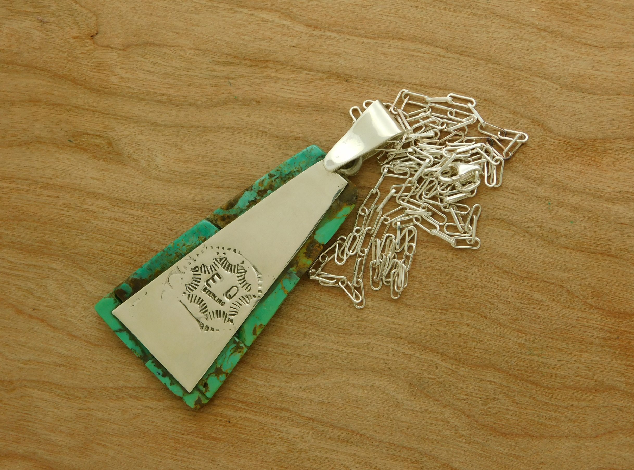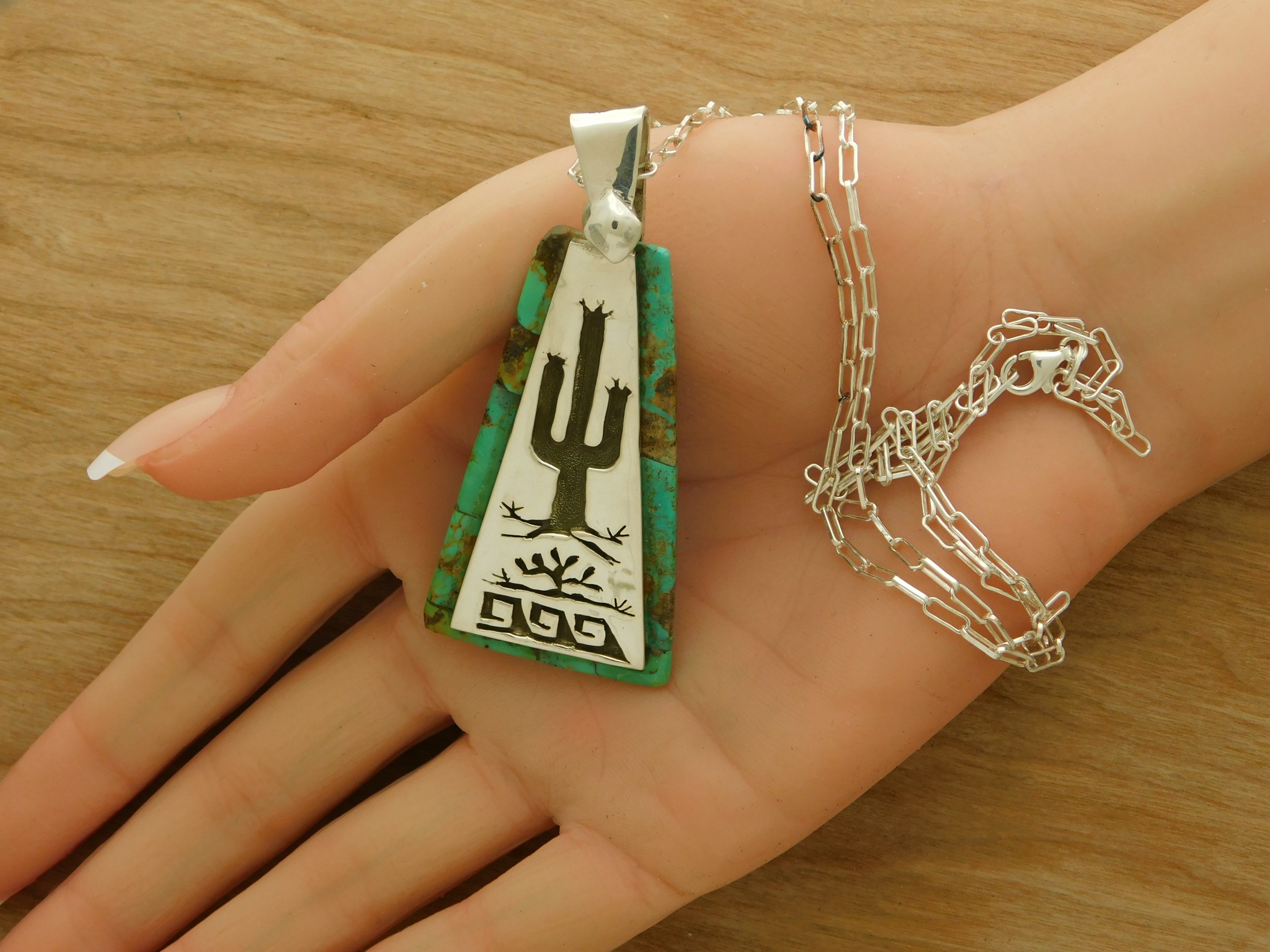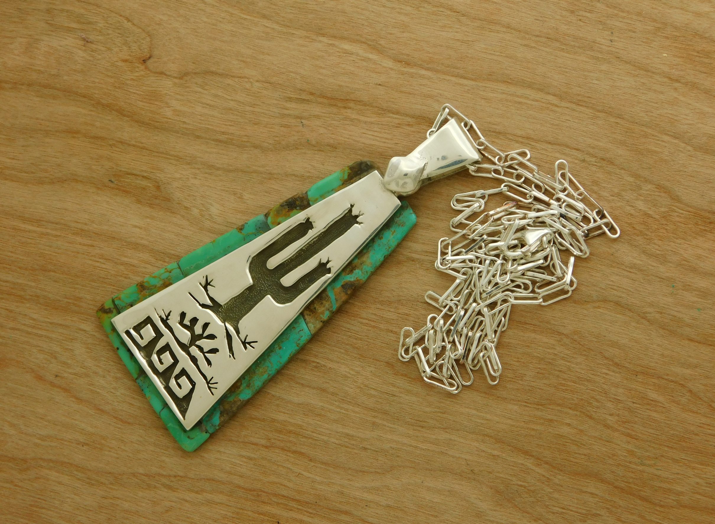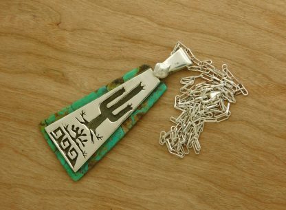 - Quinton Antone Tohono O’odham Triangle Pendant with Saguaro cactus, Turquoise border and waves.