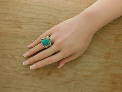 - This ring features Kingman Turquoise Center Stone & Sterling overlay desert designs.