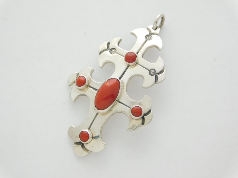- Beautiful Sterling Silver and Natural Mediterranean Coral Double Cross with bale.