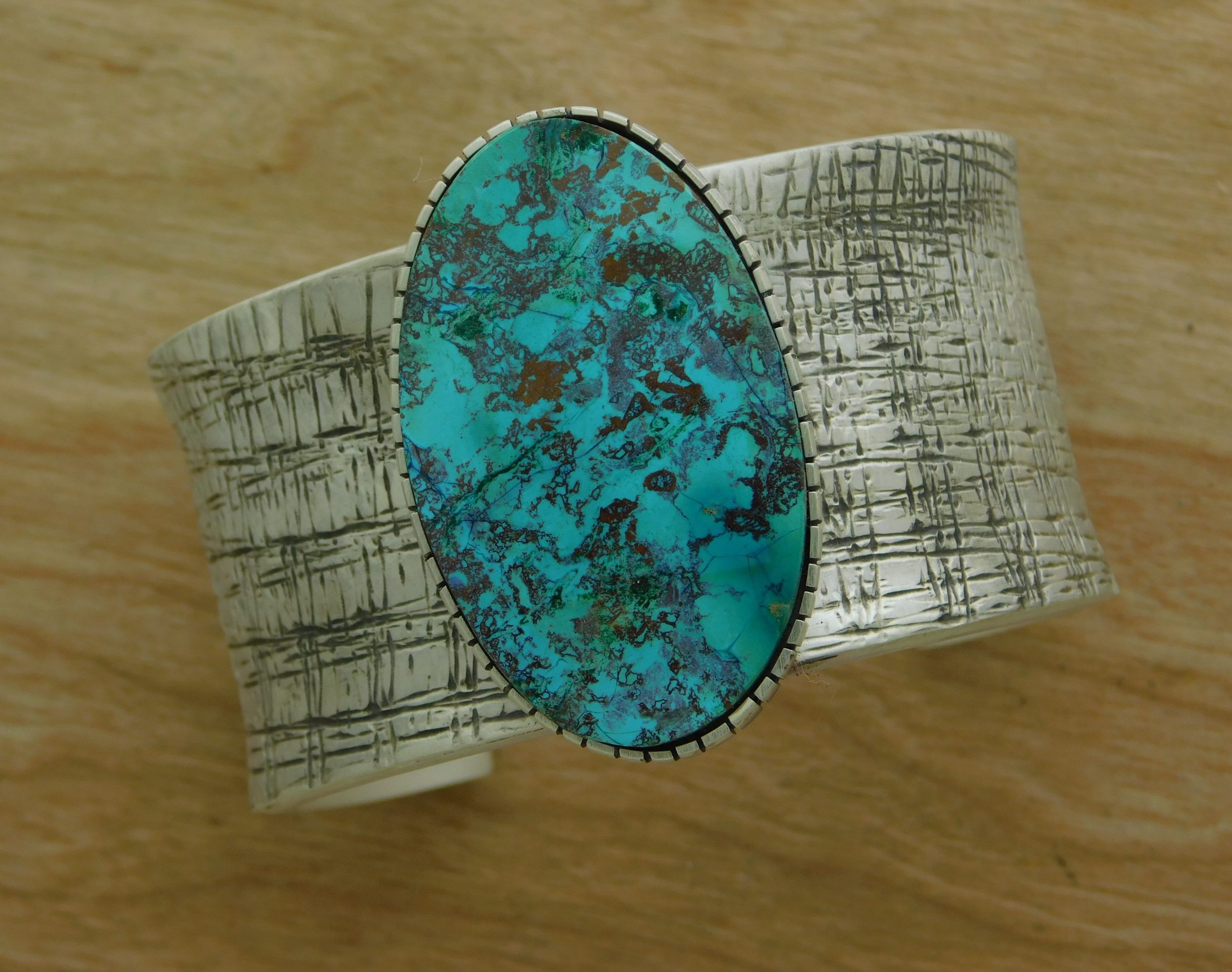 - It features chrysocolla with hand cut bezel, snakes, and sterling silver dust texture!
