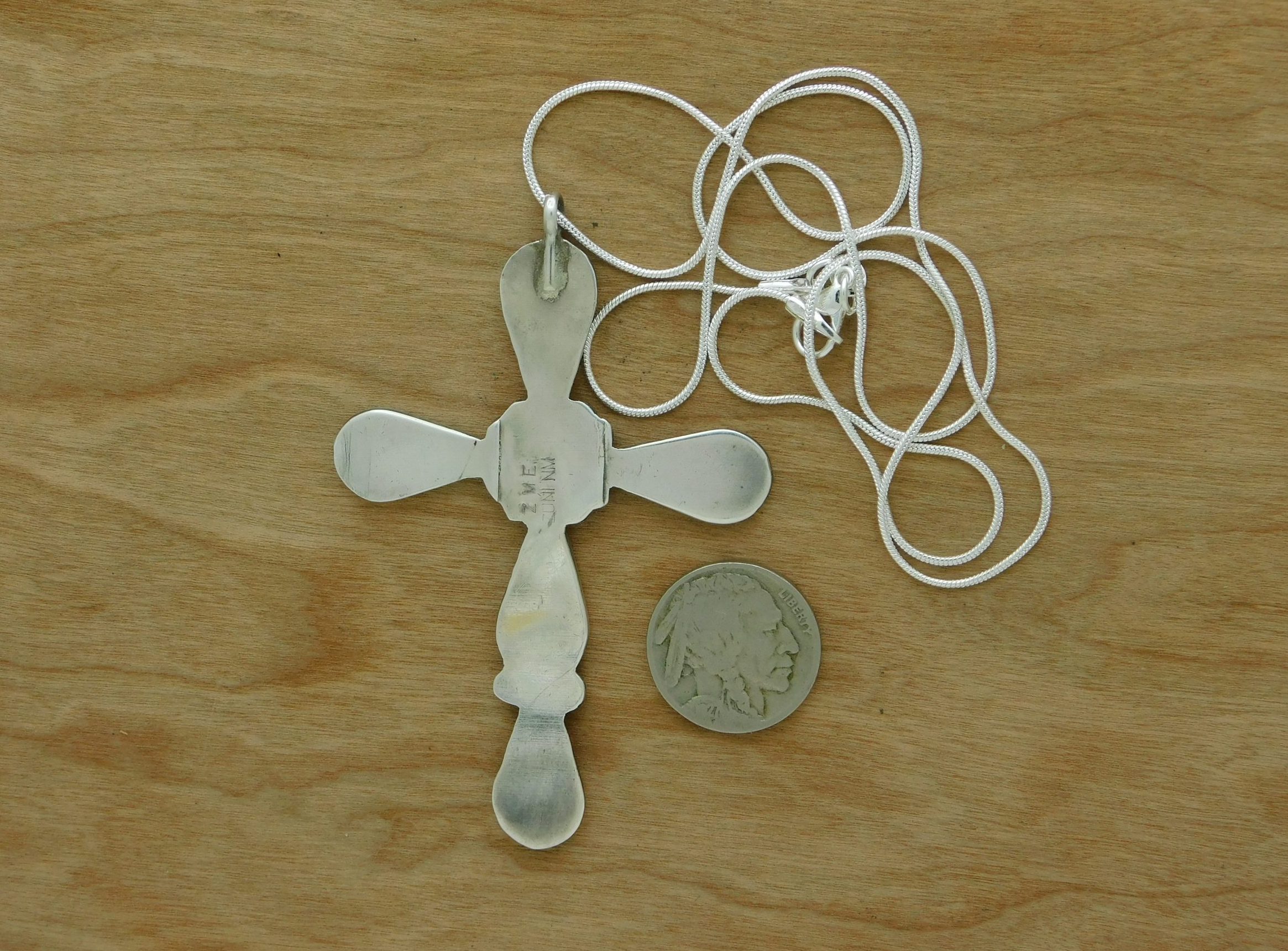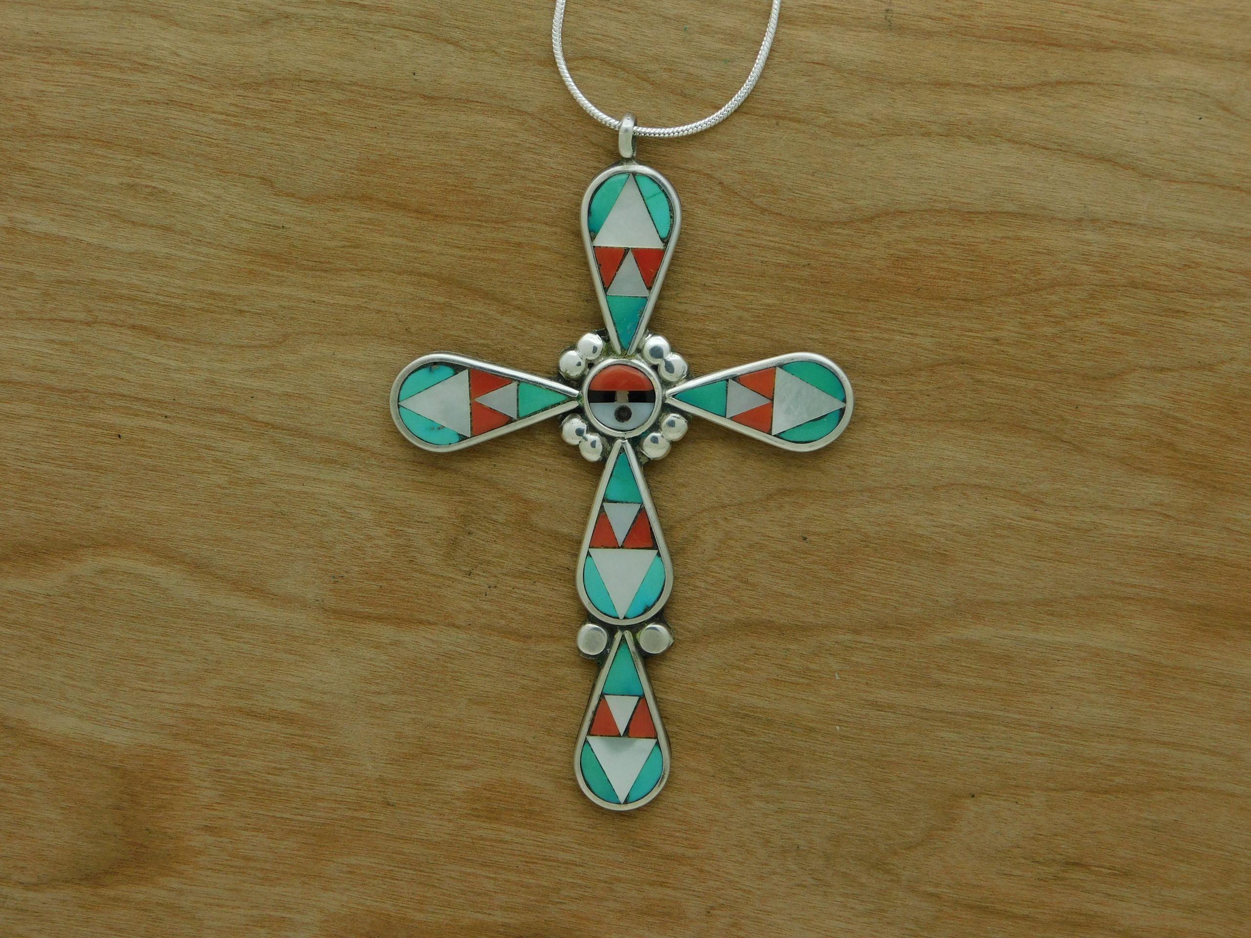 - Zeno and Maryann Edaaki Zuni Sleeping Beauty Turquoise, Mediterranean Coral and Mother of Pearl Inlay Cross
